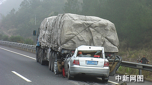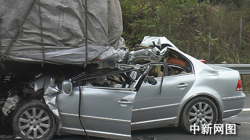 在事故現(xiàn)場(chǎng),只見一輛駛往龍游方向的鄂JC9988小轎車和浙K.JI226大型貨運(yùn)車發(fā)生追尾事故。追尾的小轎車前一半已死死卡在大貨車底盤下面,車頂已被削平,車輛嚴(yán)重變形。