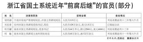 事實上,據(jù)統(tǒng)計,不僅是浙江,近年來落馬的貪官不少都與房地產(chǎn)潛規(guī)則下的腐敗有關(guān),財政部原副部長朱志剛,北京市原副市長劉志華,山東省委原副書記、青島市委原書記杜世成,天津市政法委原副書記、天津市人民檢察院原檢察長李寶金,湖南省郴州市原市委書記李大倫,安徽省原副省長何閩旭,昆明市規(guī)劃局原局長曾華,上海房地局原副局長殷國元,江蘇省蘇州市原副市長姜人杰,重慶市規(guī)劃局原局長蔣勇,重慶市沙坪壩區(qū)原副區(qū)長陳明,福州市國土資源局原局長王炳毅,福州市倉山區(qū)土地局原局長李仲……都與房地產(chǎn)腐敗有關(guān)。