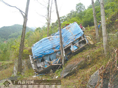 東蘭訊 4月22日上午9時許,一輛由大化瑤族自治縣七百弄鄉(xiāng)開往河池市的客運中巴車,在途經(jīng)東蘭縣花香鄉(xiāng)干來村時突發(fā)機(jī)械故障,導(dǎo)致車輛滾下90米長陡坡(垂直高度40米)。事故造成車上7名乘客先后死亡,35人不同程度受傷。