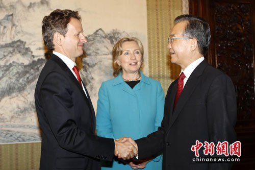中新網(wǎng)北京5月25日電 (記者 張朔)中國總理溫家寶25日下午在中南海紫光閣會見來華出席第二輪中美戰(zhàn)略與經(jīng)濟(jì)對話的美國國務(wù)卿克林頓和財長蓋特納。