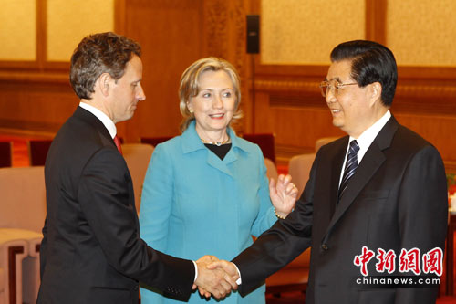 胡錦濤說,兩天來,克林頓國務(wù)卿、蓋特納財長和王岐山副總理、戴秉國國務(wù)委員一起共同主持了第二輪中美戰(zhàn)略與經(jīng)濟對話,圍繞一系列戰(zhàn)略性、全局性、長期性的問題坦誠深入地交換了意見,取得很多成果。我對此表示祝賀,并對四位特別代表的辛勤工作和高效率表示高度贊賞。