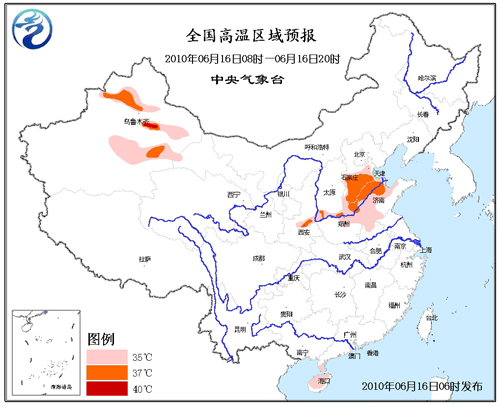 預計,今天白天,河北南部、天津西南部、山西西南部、河南北部、山東北部和西部、安徽北部、陜西關中地區(qū)以及廣東雷州半島、海南大部將有35~37℃的高溫天氣,其中,河北南部部分地區(qū)的最高溫度可達38℃;新疆北疆盆地以及南疆盆地將有35℃以上的高溫天氣,其中,吐魯番盆地最高氣溫可達40~43℃。