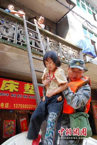 在一棟兩層高的老房子上,兩位老人焦急的招手呼喚救援,謝川江和戰(zhàn)友趕緊將沖鋒舟減速并靠近木樓。老漢姓胡,約有60來(lái)歲的樣子,看見(jiàn)解放軍來(lái)救援,老人的眼角濕潤(rùn)了起來(lái)。等沖鋒舟停穩(wěn),老漢懸下一幅木梯,先將自己8歲的小孫女和14歲的孫子送上沖鋒艇,隨后再幫助58歲的老伴登上沖鋒艇。待3人坐穩(wěn)以后,胡老漢輕聲的囑咐一聲“你們要注意安全”,隨后朝解放軍戰(zhàn)士揮手致謝。