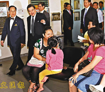 曾蔭權(quán)在香港食物及衛(wèi)生局局長周一岳和醫(yī)院管理局主席胡定旭的陪同下,22日巡視油麻地賽馬會分科診所,并慰問正接受體檢的家長及兒童。