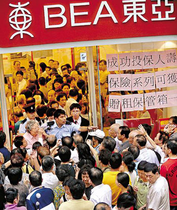 東亞銀行上周三受到不利謠言影響,港九多家分行出現(xiàn)排隊(duì)提款人龍。東亞銀行為了加強(qiáng)市民信心,當(dāng)日更特別延長服務(wù)時(shí)間半小時(shí)。該行管理層強(qiáng)調(diào),東亞銀行有足夠資金應(yīng)付市民提款,而被提走的存款金額,相對該行所預(yù)備的金額只占很少數(shù)目。