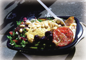 五谷雜糧和全麥谷物對(duì)健康的重要性不在話下,也是地中海地區(qū)人民常攝取的食物。希臘有風(fēng)行地中海地區(qū)的PITA面包,搭備面包的沾醬更是多采多姿,當(dāng)?shù)刈钪恼瘁u,幾乎都是以新鮮蔬菜加上橄欖油或優(yōu)格調(diào)制而成,讓人可嘗到時(shí)蔬的鮮脆滋味。新鮮蔬果不虞匱乏的希臘,此地人民看待蔬菜、水果不僅止于配菜或盤飾,而是將其營(yíng)養(yǎng)與美味發(fā)揮至極致,如蕃茄、青椒、洋蔥、茄子、小黃瓜、蔾豆、西洋芹、大蒜等,都是入菜的好材料,有了這些鮮活佐料,更讓希臘美食增色不少!此外,以油、醋腌漬的各式蔬菜、橄欖,希臘人稱之為MEZEDES,則是小酒館里常見(jiàn)的下酒菜。得天獨(dú)厚的希臘三面環(huán)海,擁抱海洋的恩惠─海鮮并不難,豐富的新鮮漁獲如魚(yú)、蝦、蟹、干貝、蛤蜊等,可輕易變化餐桌上的菜色。另外,隨處可見(jiàn)的干果零嘴攤販,擺滿花生、杏仁果、開(kāi)心果、無(wú)花果、葡萄干等干果,最能展現(xiàn)希臘的街頭風(fēng)情。