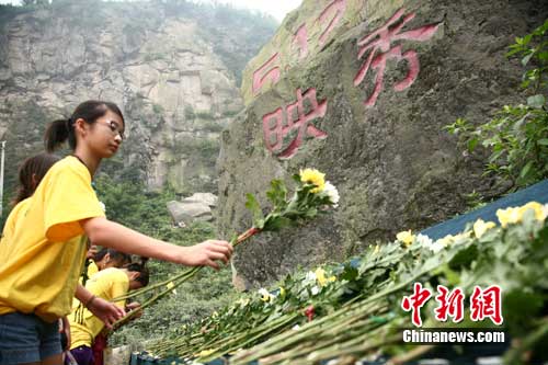 中新網(wǎng)成都7月31日電 (徐楊祎 張浪)31日,來自歐美大陸的170多位海外華裔青少年,前往“5·12汶川地震”震中映秀鎮(zhèn),參觀地震遺址,寄托哀思。在地震飛來石祭臺,同學(xué)們自發(fā)購買鮮花,深切哀悼在地震中不幸遇難的同胞們。