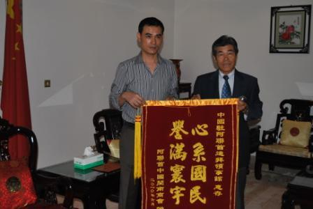 施福建家屬對(duì)施遇害后,總領(lǐng)館即派員與警方交涉并協(xié)助家屬迅速處理死者后事表示感謝。高總領(lǐng)事感謝家屬對(duì)總領(lǐng)館工作的肯定,并強(qiáng)調(diào),錦旗是對(duì)總領(lǐng)館工作的鼓勵(lì),總領(lǐng)館將一如既往地堅(jiān)持以人為本、外交為民的理念,加大與阿司法機(jī)構(gòu)合作力度,努力保障在阿中國(guó)公民的人身和財(cái)產(chǎn)安全。