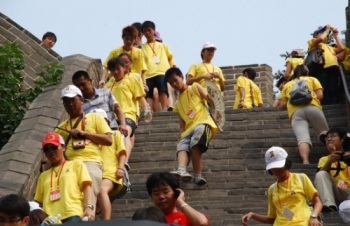 中新網(wǎng)7月28日電 據(jù)廣東僑網(wǎng)消息,在人民大會堂參加完隆重的開營儀式后,廣東省僑辦組織的550多名華裔青少年乘坐12部大巴,于7月25日下午浩浩蕩蕩的前往京城之旅的第一站——京北長城沿線最著名的古關(guān)城居庸關(guān),勇于攀登的廣東團營員成為“中國尋根之旅”團隊中的首批“好漢”,很多第一次到中國的華裔青少年實現(xiàn)了成為“長城好漢”的夢想。