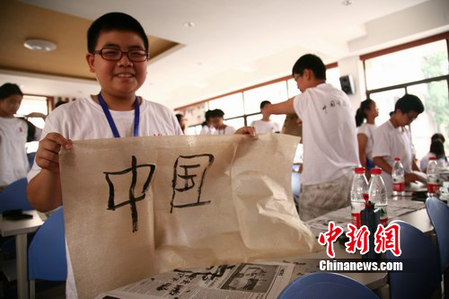 中新網(wǎng)成都7月30日電 (徐楊祎 張浪)30日上午,170多位參加“2010中國(guó)尋根之旅”夏令營(yíng)四川營(yíng)的海外華裔少年,來(lái)到位于四川大學(xué)的書(shū)法教室,學(xué)習(xí)中國(guó)書(shū)法。