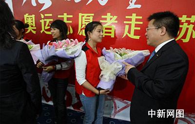奧運(yùn)志愿者甘露(右)向蘇寧員工介紹服務(wù)經(jīng)驗(yàn)