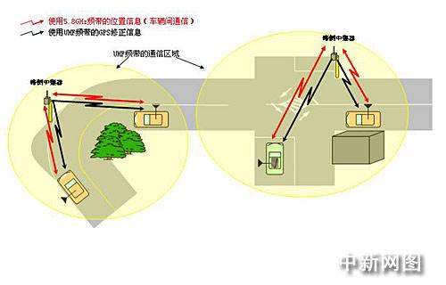 使用5.8GHz頻帶的DSRC車輛間通信功能交換位置信息。另一方面,今后,發(fā)送來自路側(cè)中繼器的GPS修正信息可以使用能被應用于ITS的UHF頻帶。