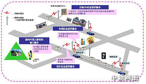 本系統(tǒng)考慮了信息通信基礎設施不十分完備的旅游觀光地的地域特性,在無線基站沒有聯(lián)網(wǎng)的情況下,也能靈活運用以車輛間通信技術(shù)為基礎的“車輛傳輸信息,以及車輛間直接構(gòu)成網(wǎng)絡”功能,提供:①當?shù)豑PO信息提供服務;②傳聞信息提供服務;③堵車信息提供服務;④面向外國人旅游觀光客的向?qū)Х⻊盏扰c旅游司機需求相匹配的信息。