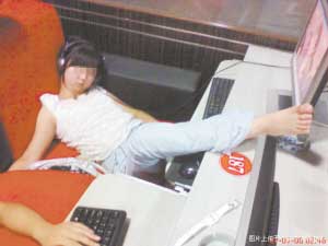 在這些被張貼出來的照片中,記者看到,有個(gè)漂亮妹妹戴著耳機(jī)不知道是在瞇著眼睛聽音樂還是已經(jīng)睡著了,一條腿放在電腦桌上;大多數(shù)上網(wǎng)者要么蜷縮在沙發(fā)上要么就坐在凳子上酣然熟睡;有的上網(wǎng)者手放在鍵盤上,可眼睛卻已經(jīng)閉上,嘴巴大張著;還有的則是男女混合躺在一起,任憑電腦屏幕閃個(gè)不停。