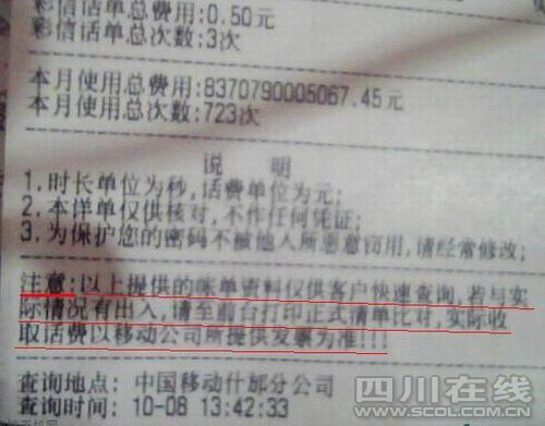 針對打印話單出錯的現(xiàn)象,中國移動客服人員表示自助打印話單機提供的話費清單僅提供用戶的通話、短信、上網(wǎng)等業(yè)務的消費情況供用戶參考,最終的話費應以在營業(yè)柜臺打印的話費單為準。