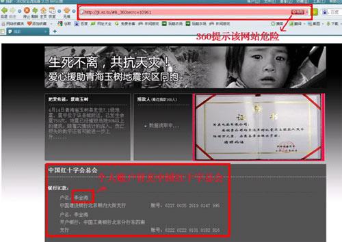 中新網(wǎng)4月24日電 360安全中心今日再度發(fā)出釣魚網(wǎng)站安全警示:近期不法分子以玉樹賑災(zāi)捐款的名義制作了大量釣魚網(wǎng)站,利用網(wǎng)友愛心大肆詐騙。360安全專家石曉虹博士為此提醒廣大網(wǎng)民,在網(wǎng)上用網(wǎng)銀、第三方支付工具等在線方式捐款一定要慎重,并盡量使用360網(wǎng)盾等有效的反釣魚軟件進行自動識別各種釣魚網(wǎng)站。