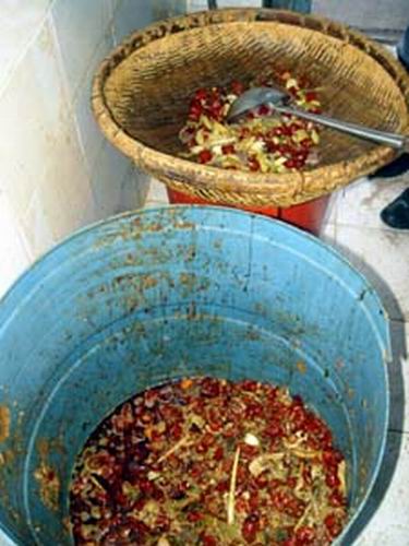 昨日下午,記者以顧客的身份來(lái)到該火鍋店,無(wú)意中在洗刷間看到,里面排放著2只一大一小臟兮兮的潲水桶。記者走近一看,發(fā)現(xiàn)大桶里有很多剩菜,包括暗紅的辣椒、蔬菜、鴨血、餐巾紙、煙頭、筷子等各種雜物。旁邊的一個(gè)小桶上擱著一個(gè)竹筐和一把勺,筐中已經(jīng)盛了許多辣椒和大蒜等剩菜。記者詢(xún)問(wèn)一名進(jìn)來(lái)端盤(pán)子的服務(wù)員,撈起這些剩菜做什么用途時(shí),對(duì)方稱(chēng)老板規(guī)定,客人吃剩的菜不能隨便倒,還可以用。但該服務(wù)員很快就意識(shí)到說(shuō)漏了嘴,立即問(wèn)記者進(jìn)洗刷間做什么。記者再問(wèn),對(duì)方三緘其口。