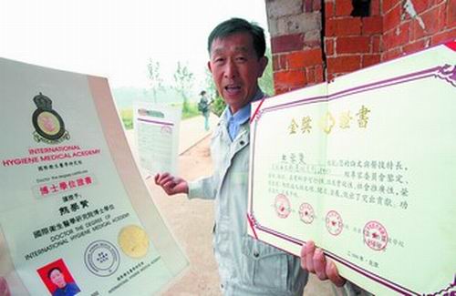 熊學(xué)賢從一個(gè)箱子內(nèi)抱出一疊厚厚的證書:中華科技咨詢專家、全國(guó)首屆十大高級(jí)民間傳統(tǒng)療法師金獎(jiǎng)、中華人民共和國(guó)杰出人才、世界名人學(xué)術(shù)博覽會(huì)發(fā)明專利金獎(jiǎng)、英國(guó)醫(yī)學(xué)院自然醫(yī)學(xué)及天然藥物研究中心客座課題教授、日內(nèi)瓦發(fā)明家公會(huì)會(huì)員……據(jù)了解,這些榮譽(yù)稱號(hào)是由世界民間傳統(tǒng)療法師聯(lián)誼會(huì)、北京炎黃經(jīng)絡(luò)研究中心、香港國(guó)際醫(yī)學(xué)科學(xué)研究院、國(guó)際衛(wèi)生醫(yī)學(xué)研究院等組織頒發(fā)給他的。