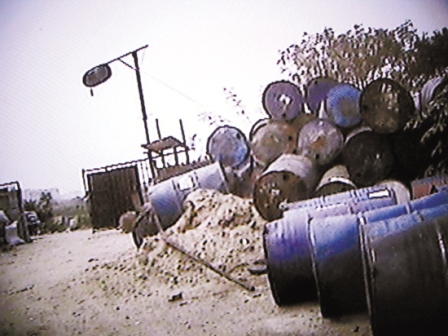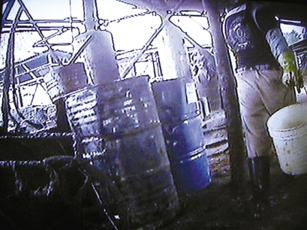 昨天下午,羊城晚報(bào)記者以收購(gòu)“潲水油”為名,進(jìn)入該家煉油窩點(diǎn)。從泰龍工業(yè)園附近的一條小路拐入,穿過(guò)鐵路涵洞不到100米即到,門(mén)口以竹柵欄做門(mén),未見(jiàn)廠名或掛任何招牌,卻用木桿高高掛起一個(gè)油桶。人一走近門(mén)口,一陣難聞的餿臭味便迎面撲來(lái),入門(mén)左側(cè)堆放了幾十個(gè)空油桶,還有一堆堆榨剩的油渣。場(chǎng)內(nèi)中央并排連著十幾個(gè)大水泥池,池內(nèi)裝填有大量剩飯剩菜等食品垃圾,空氣里彌漫著惡臭,令人掩鼻;再往里走,是一架帶有發(fā)動(dòng)機(jī)的簡(jiǎn)陋榨油機(jī),機(jī)器轟鳴聲中,不斷有深黃色的油液被擠出,滴到榨油機(jī)下方的一個(gè)槽里;旁邊還有幾個(gè)貌似用作煮油的圓筒裝置,周?chē)臀蹪M地。記者現(xiàn)場(chǎng)看到,場(chǎng)內(nèi)沒(méi)有一間固定建筑,全是用木頭、鎂瓦搭建起來(lái)的粗陋臨時(shí)棚寮。