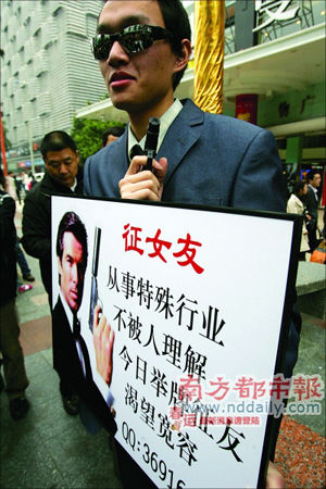 墨鏡、領(lǐng)帶、藍(lán)灰西服,一手拿把玩具左輪手槍,一手舉個(gè)紙牌站在深圳市華強(qiáng)北對(duì)看客頻頻點(diǎn)頭致意。昨日,深圳一男子自稱在成人用品行業(yè)工作,找不到女友,特意打扮成這個(gè)“007造型”,舉牌征女友。