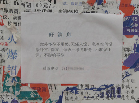 近日記者走進(jìn)某高校,在一個靠近圍墻的廣告欄上,不起眼的角落里貼著一張小廣告,上面寫著“無痛人流一條龍服務(wù),不影響上課……”