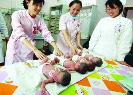 核心提示:山東一名孕婦昨日順利產(chǎn)下龍鳳四胞胎,二男二女,健康狀況良好。父母為他們?nèi)∶皻g歡、迎迎、奧奧、運(yùn)運(yùn)”,以迎接奧運(yùn)會(huì)的到來。
