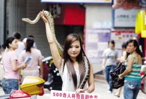 這名自稱(chēng)叫“優(yōu)優(yōu)”的年輕女子說(shuō),她今年22歲,陜西人,曾是專(zhuān)業(yè)舞蹈演員。她從小不怕蛇,3年前自己養(yǎng)起了蛇,剛開(kāi)始由于缺乏專(zhuān)業(yè)養(yǎng)殖知識(shí),死了好幾條蛇,她為此十分難過(guò),F(xiàn)在她對(duì)“蛇性”相當(dāng)了解,還學(xué)起了蛇舞、印度舞、肚皮舞。優(yōu)優(yōu)指指脖子上的蛇稱(chēng),這是條緬甸蟒,10多斤重,進(jìn)食胃口很大,不僅要吃豬肉,而且一次能吃七八只和鴿子差不多大小的鳥(niǎo)。由于養(yǎng)蛇,這幾年來(lái)優(yōu)優(yōu)一直單獨(dú)一人居住,“沒(méi)幾個(gè)人不怕蛇的,我只能帶著蛇單獨(dú)過(guò)。”帶蛇來(lái)“逛”山西路,優(yōu)優(yōu)另有目的,她背后的胡導(dǎo)稱(chēng),他計(jì)劃花5年時(shí)間搜集500個(gè)奇人,拍攝奇人喜劇電影,讓他們展示各自絕技,目前有人愿出數(shù)百萬(wàn)拍攝。