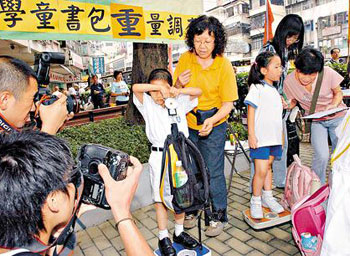 香港學(xué)童書包超重嚴(yán)重,雖然醫(yī)學(xué)界建議書包重量不超過(guò)體重10%,但早前民建聯(lián) 一項(xiàng)調(diào)查顯示,香港學(xué)童書包重量平均達(dá)3.9公斤,最重更達(dá)7公斤,其中有一年級(jí)學(xué)童書包超重最為嚴(yán)重,平均比標(biāo)準(zhǔn)重量高出近49%。