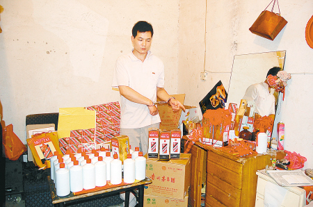 在一間廁所里,有人正在勾兌假名牌酒,周圍環(huán)境極為骯臟,臭氣熏天。袁的父母和懷孕的妻子,也在院中幫著洗刷裝假酒的酒瓶。民警在此處查獲了大量成品和半成品的假名酒,還收繳了很多假冒的商標(biāo)、內(nèi)外包裝和名牌酒包裝盒內(nèi)附贈的禮品等。這些制假物品裝了滿滿一卡車。