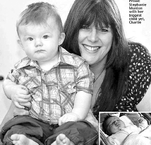 英國(guó)西約克郡彭特弗萊克市41歲女教師斯蒂芬妮·蒙頓16年前生下第一個(gè)女兒安布時(shí),她以為自己生下了一個(gè)“巨嬰”,因?yàn)榘膊忌聛?lái)竟重達(dá)9.6斤。然而令斯蒂芬妮做夢(mèng)也沒(méi)想到的是,她又接連生下了另外3個(gè)兒女,并且這些孩子就像暗暗較勁一樣,出生時(shí)一個(gè)比一個(gè)重,斯蒂芬妮最小的孩子、如今7個(gè)月大的查利出生時(shí)竟重達(dá)12斤!斯蒂芬妮發(fā)誓以后再也不敢懷孕了,因?yàn)樗裏o(wú)法想象如果自己再生第5個(gè)孩子,這個(gè)孩子的體重將會(huì)多驚人。