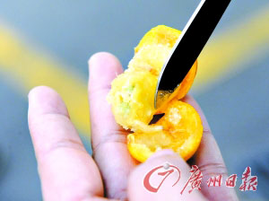 記者根據(jù)龔先生的引導(dǎo),在石溪南約東街附近懷疑有問(wèn)題的水果檔花2.5元買了25個(gè)金橘,一個(gè)一個(gè)剝開(kāi)來(lái)后,發(fā)現(xiàn)總共15個(gè)里頭是有蛆的。蛆蟲(chóng)呈米色,只有不到1厘米長(zhǎng),大都藏在果肉里頭,打開(kāi)果皮后還能看到它在蠕動(dòng)。有蛆的金橘摸上去都很軟,里頭的果肉組織往往被蟲(chóng)蛀成一條條小通道。這種蛆金橘個(gè)頭比較小,有別于之前報(bào)道的曾發(fā)現(xiàn)蛆蟲(chóng)的那種大柑橘。