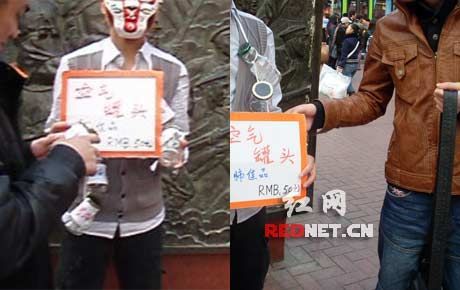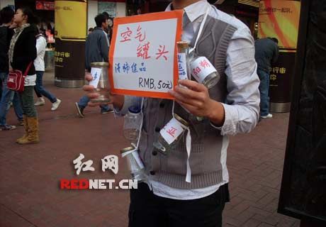 “發(fā)寶氣的吧?太扯淡了,竟然叫賣空氣!”23日傍晚,網(wǎng)友“閃賞”在紅網(wǎng)論壇發(fā)帖爆料,稱自己當(dāng)天下午在長(zhǎng)沙黃興路步行街逛街,在黃興銅像旁看到一男子臉上戴著面具,全身掛滿了寫著陽朔、三亞、可可西里、九寨溝字樣的玻璃瓶,手舉“空氣罐頭,50元”的紙牌,引來不少人圍觀。男子自稱空氣是從全國(guó)各地方收集來的,屬他勞動(dòng)成果,所以他有理由出售而贏利。