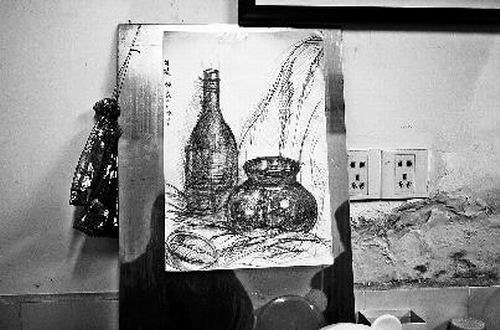 屋里的一面沙發(fā)上,還有十多張?bào)泱惝嫷乃孛,其中一張素描《瓶子和橙子》擺放在客廳。這張畫上的字跡與她寫給母親的遺言條字跡如出一轍。