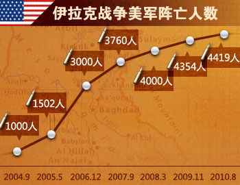 在攻打伊拉克的大規(guī)模軍事行動中,美軍只有138名軍人喪生。但此后美軍頻繁遭到伊拉克境內(nèi)反美武裝的襲擊,傷亡人數(shù)不斷攀升。截至2010年8月16日,駐伊美軍死亡總數(shù)已達4415人,另有約3.2萬人在戰(zhàn)斗中受傷。龐大的軍費開支也給美國經(jīng)濟造成沉重負擔。截至2010年8月19日,美國用于伊戰(zhàn)的開支已達7423億美元,平均每天耗費2.75億美元。