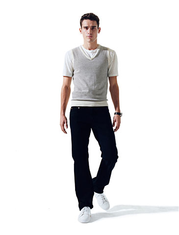 二:做舊的黑色?肯定!Marky Ramone 可能更喜歡他的黑色牛仔褲,但時(shí),如果你穿著一件運(yùn)動(dòng)背心外套,或者休閑毛衣的話,仔褲最好也要具有同樣的優(yōu)雅質(zhì)地才可以。我們建議你選擇一跳炭灰黑色的略有褪色的仿舊效果仔褲,然后白色T恤,加上運(yùn)動(dòng)鞋,就可以了。