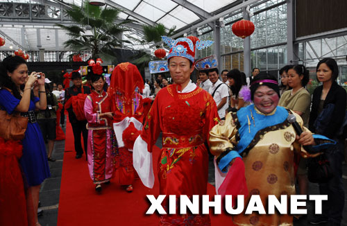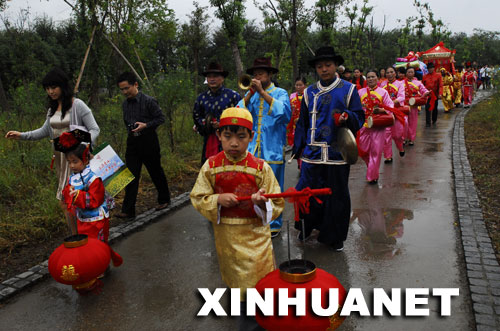 10月4日,在婚禮現(xiàn)場,新人在“媒婆”的引領(lǐng)下前去拜堂。 當日,一場充滿江南婚俗韻味的中式婚禮在上海市金山區(qū)廊下鎮(zhèn)中華村舉行,一對白領(lǐng)新人在親朋好友和游人的見證下拜堂成親,熱鬧的婚禮場面吸引了前來觀光旅游的中外游客。新華社發(fā)(蔡耀放 攝)