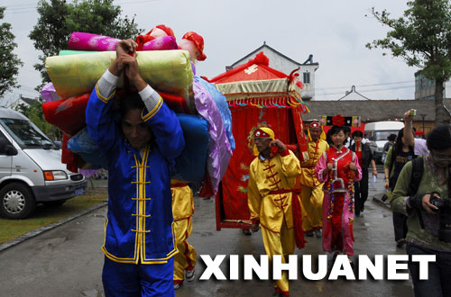 10月4日,新娘乘坐大紅花轎進入婚禮現(xiàn)場。 當日,一場充滿江南婚俗韻味的中式婚禮在上海市金山區(qū)廊下鎮(zhèn)中華村舉行,一對白領(lǐng)新人在親朋好友和游人的見證下拜堂成親,熱鬧的婚禮場面吸引了前來觀光旅游的中外游客。 (蔡耀放)
