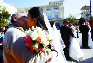 “你愿意做我妻子嗎?”81歲的吳介琴單膝跪地向愛(ài)人蔣曉輝求婚時(shí),在場(chǎng)親朋給予3分鐘的掌聲。昨日,與另十對(duì)網(wǎng)戀成功的情侶一起,81歲的吳介琴與小自己23歲的蔣曉輝走進(jìn)結(jié)婚殿堂。婚后他們將在四川生活。