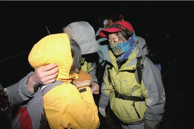 大約搜索了一小時(shí)后,一名救援人員突然發(fā)現(xiàn)漆黑的山頂處閃出了一點(diǎn)亮光!翱炜瓷侥沁呌泄饬!”救援人員全部停下了腳步,關(guān)掉頭燈,朝山頂?shù)姆较蛱魍!安缓靡馑,是星星,別緊張了!币幻仍藛T長(zhǎng)嘆了一聲。緊張的搜救氣氛頓時(shí)得到了緩解,大家相視一笑,繼續(xù)行進(jìn)。