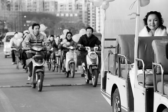 他們和學(xué)校聯(lián)系,花了60塊錢租來了學(xué)校里用來載學(xué)生和游客的觀光車作為婚車,又召集同門同學(xué),準(zhǔn)備了8輛自行車和4輛電瓶車。