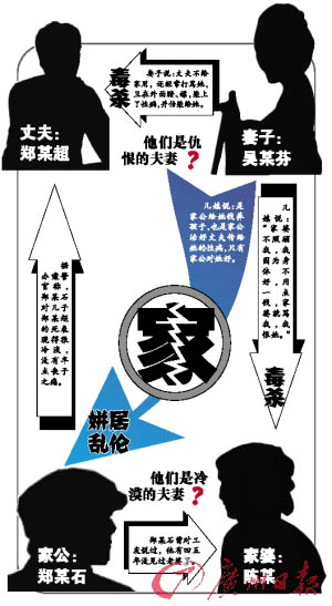 7月12日,廣西桂平人鄭某超開摩托車途經(jīng)封開時(shí)中毒身亡,妻子吳某芬不知去向。鄭某超一家的禍?zhǔn)乱患右患,身在廣州番禺打工的鄭母也離奇失蹤。專案組的民警通過近4個(gè)月的取證和調(diào)查,案情終于水落石出。11月,兇手吳某芬在湖南被抓,其對(duì)殺害丈夫與婆婆的犯罪事實(shí)供認(rèn)不諱。據(jù)吳某芬交代,她之所以下此毒手,源于家庭不和,丈夫與婆婆對(duì)她不好,讓她記恨在心。一幕謀殺親夫、加害婆婆、與家公通奸的家庭悲劇由此而上演。封開警方昨日公布的這一案情讓人看后感慨萬千。