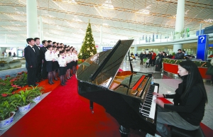 昨日(12月25日),首都機(jī)場3號航站樓內(nèi),旅客在合唱團(tuán)伴奏下跳舞。當(dāng)日,機(jī)場在2、3號航站樓增加“文化國門”系列演出,30名機(jī)場員工組成的合唱團(tuán)參演。機(jī)場負(fù)責(zé)人表示,2009年起,每逢重大節(jié)日、旅客進(jìn)出港高峰期,機(jī)場都將邀請外界演出團(tuán)體或發(fā)動內(nèi)部員工表演等,為旅客提供文化表演。(李立強(qiáng) 通訊員荊雷 攝影報道)