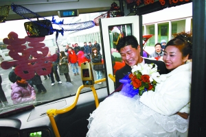 昨日,兩輛公交車成了一對新人的“重量級”婚車。新郎于浩是公交車司機(jī),新娘賈春穎是公交站調(diào)度員。新郎抱著新娘上車時(shí),司機(jī)說“先生請刷卡”。