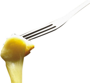 “奶酪火鍋”是瑞士最普遍、最具盛名的火鍋之一。瑞士人制作“奶酪火鍋”一般都是先以蒜涂抹于鍋底,再將不同口味的硬奶酪擦成碎末放入鍋中加熱成糊狀,再加淀粉、白葡萄酒、大蒜、奶油等,繼續(xù)煮并慢慢攪拌至完全融化呈濃濃的煉乳狀,最后放進一些黑胡椒即可。上桌后,人們用長柄叉子叉著切成四五厘米見方的“法式長棍面包”蘸著奶酪吃,很像中國的“拔絲香蕉”。此外,吃這種火鍋時,瑞士人還特別喜歡配上有助于清口的風(fēng)干牛肉、腌酸黃瓜、小洋蔥。不過,吃這種火鍋一定要“點到為止”,雖然奶酪富于營養(yǎng),但很難消化,用白葡萄酒融化奶酪,就是為了幫助消化!