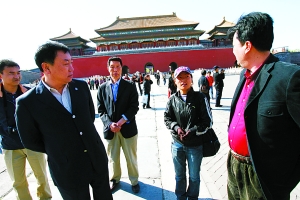 北京市旅游局副局長于德斌(左2)帶隊檢查旅游市場時,一名婦女(右2)上前向他自薦黑導(dǎo)游。昨日,北京市旅游局聯(lián)合城管、治安總隊等到故宮檢查無證導(dǎo)游帶團(tuán)現(xiàn)象。由于都是便裝,執(zhí)法人員還沒走到太和殿,一名無證女導(dǎo)游就迎了上來,詢問是否需要導(dǎo)游。執(zhí)法員隨后表明身份,要求她到指定地點接受處理。本報記者 吳江 傅沙沙 攝影報道