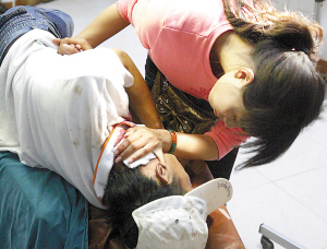 昨日下午3點多鐘,脖子血流不止的周方被救護(hù)車送進(jìn)市急救中心后拒絕進(jìn)入急診室接受治療。記者看到,周方的脖子左側(cè)有一道長約6公分的刀傷,鮮血直流,染紅了白色T恤和頭上的棒球帽。醫(yī)護(hù)人員和匡非好不容易將他勸進(jìn)去,他卻趴在病床上痛哭不已,約10分鐘后,才平靜下來,接受了縫合處理。據(jù)醫(yī)生介紹,周方的傷口淺,未傷及主動脈,無生命危險。