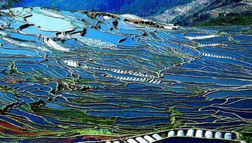 海拔2500米的云南哀牢山區(qū)元陽梯田平地極少,到處是濃綠的原始森林的哀牢山區(qū),世代居住著哈尼族為主的山地居民。2500年前,哈尼族的祖先從西藏高原來到云南南部這個(gè)邊陲山區(qū),初來乍到就遇到了一大難題:周圍的山谷根本不適宜種植。哈尼族人以頑強(qiáng)的民族性格與大自然搏斗,用石塊砌起圍墻,圍住新開墾的農(nóng)田,還引來山泉灌溉,并在水霧繚繞的梯田中種植稻谷。