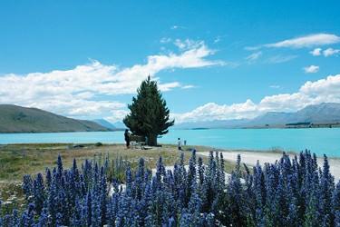 擱下行李我們一直向南而去,尋找皇后鎮(zhèn)南端的人間仙景蒂卡波湖。寂靜的湖面,四周覆蓋著蒼翠的樹木和盛開的魯冰花,加上對岸雪山倒影,四季美景濃縮一簾。缺水的新西蘭島國對湖水的利用可以說是費(fèi)煞苦心,海拔700多米的高山湖泊,筑了7條人工導(dǎo)流明渠,不但用以截流灌溉,而且,還在每一出水口修建了水利發(fā)電廠,7座電廠為南島的畜牧農(nóng)漁提供了豐裕的清潔能源?蒲腥藛T還在截流湖中試養(yǎng)原本生活在大海里的“三文魚”。第一次見到在淡水中游弋的“三文魚”,怎不叫人嘴饞!花上10個紐幣,我們吃上了活殺生食的淡水“三文魚”。說實話,這人工飼養(yǎng)的淡水“三文魚”太肥太油膩,口感和味道遠(yuǎn)差海水“三文魚”一籌,但我還是由衷感到高興,這畢竟是人類由漁到養(yǎng)的轉(zhuǎn)變,“三文魚”將永不枯竭。食罷魚宴,不久,我們的車已駛?cè)肓诵挛魈m著名的南島水果園,紅的櫻桃、粉的水蜜桃、黃的杏子、綠的蛇果,五顏六色的累累碩果,掛得樹條彎下了腰。為了充分利用水資源,每棵樹下均有一條微型水管進(jìn)行滴灌,晝夜較大的溫差,明媚陽光的輻射和沒有污染的潔凈空氣,給水果提供了優(yōu)良的生長環(huán)境,來到了果園,人人現(xiàn)摘現(xiàn)吃。導(dǎo)游見我從樹上摘下櫻桃還要在自己T恤上蹭蹭,便告訴我說,不用蹭,這里的水果很干凈。于是,我扔幾粒入口,原汁原味。