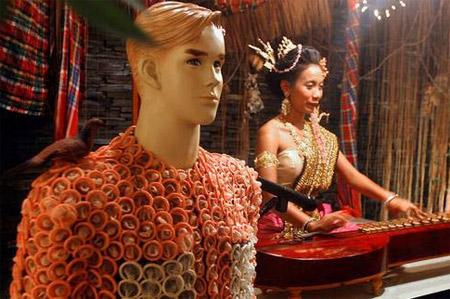 進入餐廳的室內(nèi)區(qū),就像進入安全套的博物館。墻壁上都是全球具有代表性的安全套產(chǎn)品的展覽,按照國別分裝在各自的格子里,不同的材料、顏色、形狀,漫步一圈能大致了解安全套的發(fā)展史。屋頂?shù)牡鯚粢惨园踩鬃鳛檠b飾,閃出不同顏色的光芒。餐桌設(shè)計也很獨特,桌面玻璃板的圖案是由安全套組合完成?繅Φ牟妥琅赃能欣賞到一幅幅被“加工”過的名畫,連舉世聞名的蒙娜麗莎也客串了一回安全套的宣傳大使,手中拿著安全套沖著客人微笑。