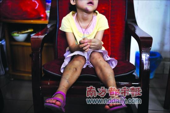 昨日下午3時,在花都區(qū)明日之星幼兒園,大(2)班的班主任巫老師把小怡帶進園長辦公室。小怡裸露在外的臉部、雙手、雙腳,可見幾十處淤青和剛剛結痂不久的傷口。